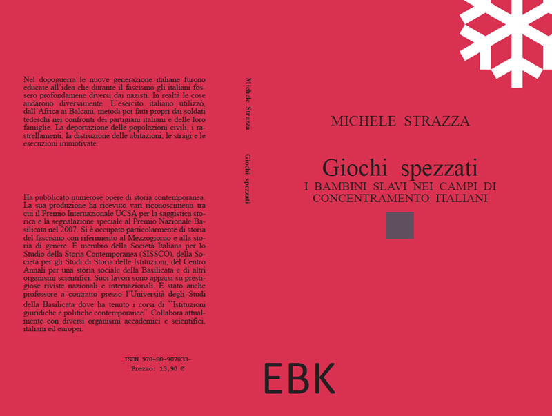 E’ stato appena pubblicato dalle Edizioni Leucotea-EBK di Sanremo (IM) il nuovo libro di Michele Strazza: Giochi spezzati. I bambini slavi nei campi di concentramento italiani (1942-1943). L’autore lucano, profondo conoscitore della storia italiana durante il fascismo, riporta alla luce una pagina dolorosa e dimenticata della nostra storia recente, l’internamento dei bambini slavi nei campi di concentramento italiani. La ricerca intende sfatare luoghi comuni sulla “diversità” dei soldati italiani, invitando il lettore a soffermarsi sulla tragicità di eventi poco conosciuti. La deportazione delle popolazioni civili, i rastrellamenti, la distruzione delle abitazioni, le stragi e le esecuzioni immotivate, i campi di concentramento non furono patrimonio solo dei nazisti ma strategie studiate e praticate dal Regio Esercito nei territori che occupò. Tra i crimini di guerra italiani particolarmente odiosa appare la reclusione di donne e bambini nei campi di concentramento a seguito dell’occupazione della Slovenia. Arbe e Melada in Jugoslavia, Gonars e Monigo in Italia, sono solo alcuni dei luoghi simbolo di uno sterminio per fame e malattie di tantissimi bambini che non avevano nessuna colpa, uno sterminio tollerato e consentito dalle autorità militari italiane. Ricordare Vilijem Malnar, “piccolo angelo” morto ad appena due mesi nel campo di Arbe, così come le altre vittime di questa strage silenziosa e nascosta, è un dovere – si legge nel libro - per chi ritiene la ricerca storica, non solo attività di studio scrupoloso e documentato, ma anche impegno civile e servizio all’umanità.
